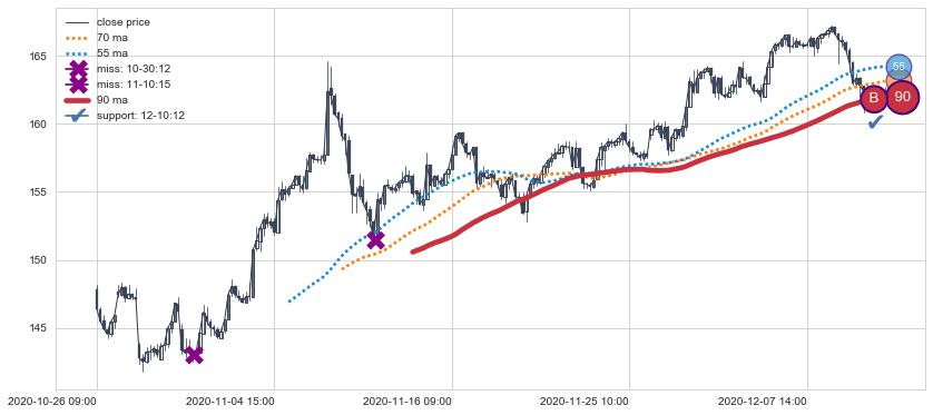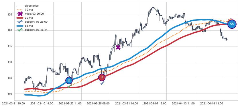 上涨趋势03-11 10:00-04-19 15:00,均线90, 55确认关键支撑2处