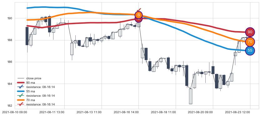 下跌趋势08-10 09:00-08-23 12:00,均线90, 70, 55确认关键阻力1处