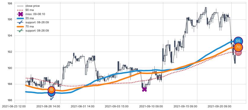 上涨趋势08-23 12:00-09-20 11:00,均线70, 55确认关键支撑1处