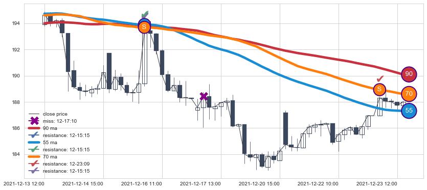 下跌趋势12-13 12:00-12-23 13:00,均线90, 70, 55确认关键阻力2处