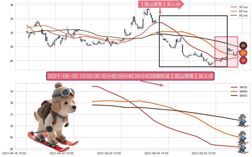 ⚀ 2021-08-23 12:00:00小时-2021-09-07 14:00:00小时显现 30小时-60小时-90小时均线 【高山滑雪】买入点 看多信号,后市看涨,买入