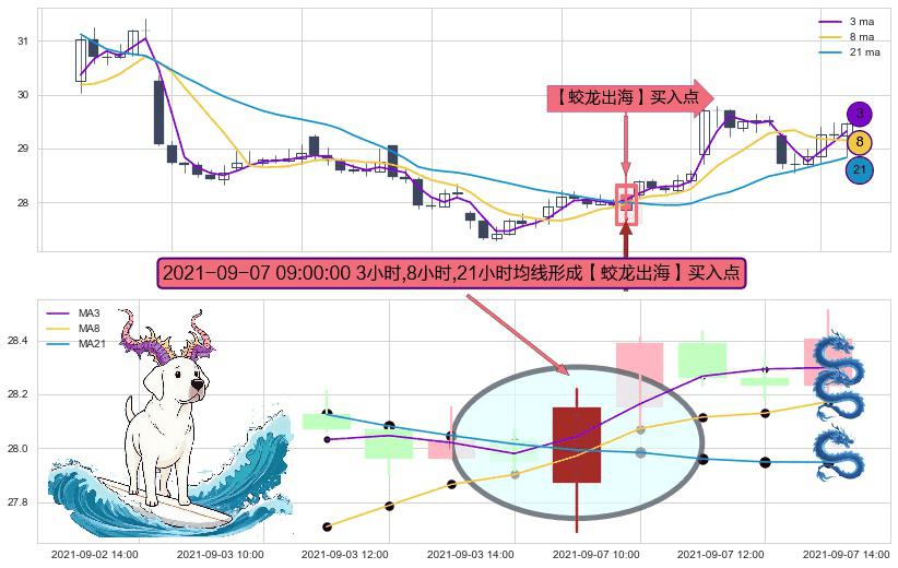 ⚀ 2021-09-07 09:00:00小时显现 3小时-8小时-21小时均线 【蛟龙出海】买入点 看多信号,后市看涨,买入