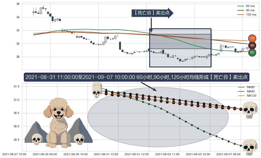 ⚀ 2021-08-31 12:00:00-小时至2021-09-07 10:00:00-小时显现 60小时-90小时-120小时均线 【死亡谷】卖出点 看空信号,后市看跌,卖出