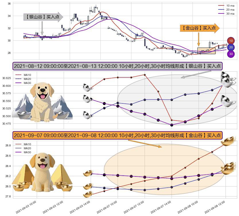 ⚀ 2021-09-07 10:00:00-小时至2021-09-08 12:00:00-小时显现 10小时-20小时-30小时均线 【金山谷】买入点 其再次确认了买入信号,可靠性更强,买入