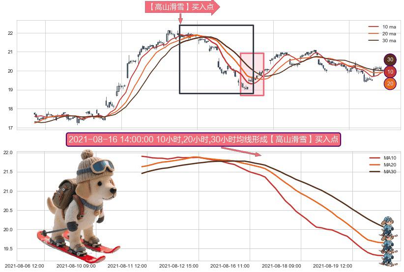⚀ 2021-08-11 11:00:00小时-2021-08-20 11:00:00小时显现 10小时-20小时-30小时均线 【高山滑雪】买入点 看多信号,后市看涨,买入