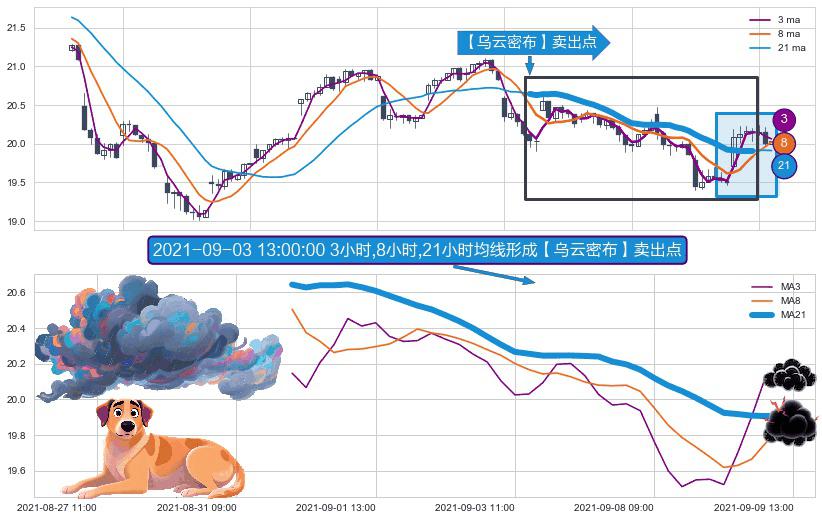 ⚀ 2021-08-31 13:00:00小时-2021-09-09 12:00:00小时显现 3小时-8小时-21小时均线 【乌云密布】卖出点 看空信号,后市看跌,卖出