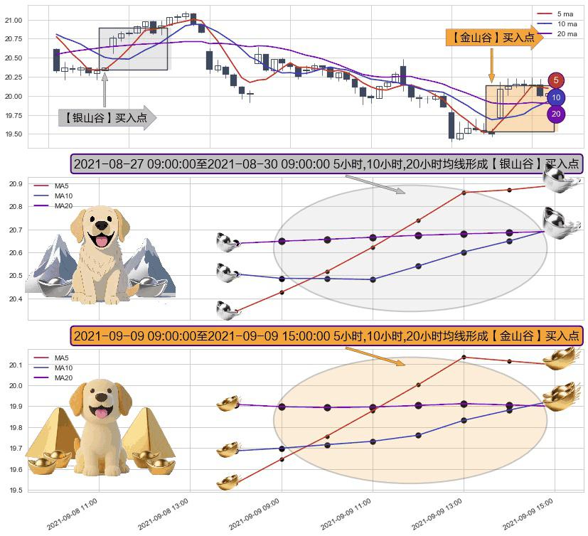 ⚀ 2021-09-09 10:00:00-小时至2021-09-09 15:00:00-小时显现 5小时-10小时-20小时均线 【金山谷】买入点 其再次确认了买入信号,可靠性更强,买入