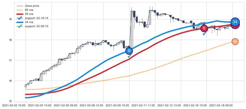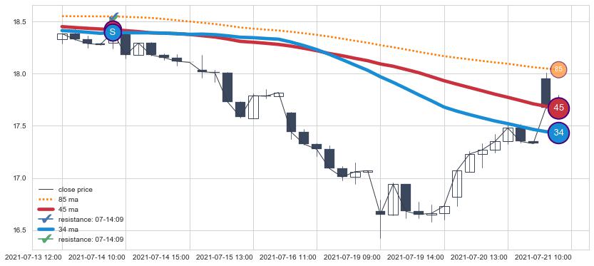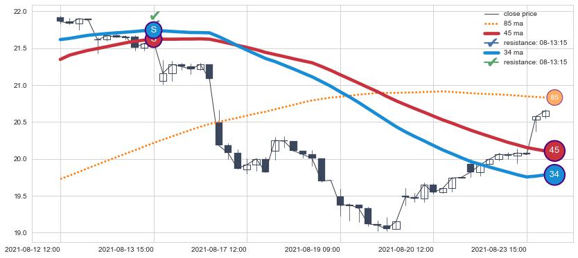 ⚁ MA3和MA8走势平行,且始终保持在短距离内,MA21始终在短中期均线上方,与短中期均线保持一定的距离,微微下行