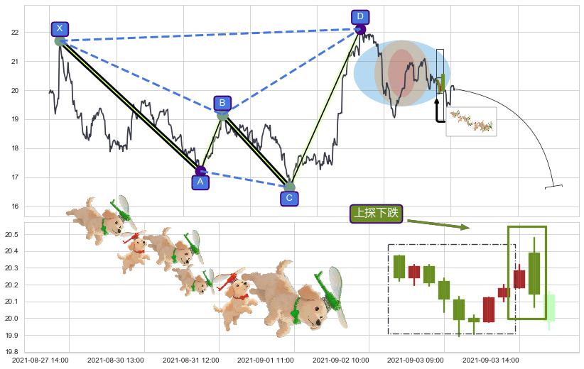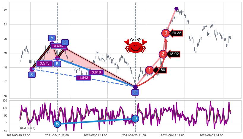 | 6 🅚:两黑夹一红 ➕ 📡:谐波鲨鱼已到达d点:猜想c拉升到达d点后泄力性下沉下跌(均值回复) ☞ 看空信号 ⇥ 【🅚线】交织【图形】⇥ 综合量化分数: 42 | > |