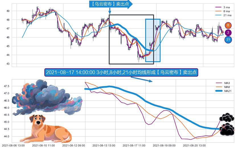 形态多维评估: ⚀ 2021-08-12 09:00:00小时-2021-08-23 12:00:00小时显现 3小时-8小时-21小时均线 【乌云密布】卖出点 看空信号,后市看跌,卖出