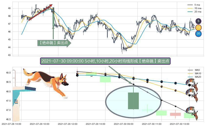 形态多维评估: ⚀ 2021-07-30 09:00:00小时显现 5小时-10小时-20小时均线 【绝命跳】卖出点 看空信号,后市看跌,卖出