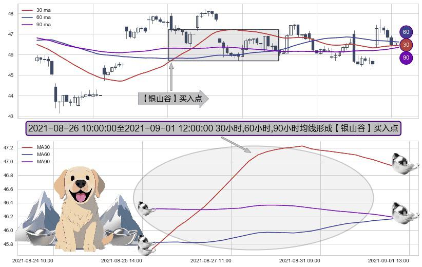 形态多维评估: ⚀ 2021-08-26 11:00:00-小时至2021-09-01 12:00:00-小时显现 30小时-60小时-90小时均线 【银山谷】买入点 看多信号,后市看涨,买入