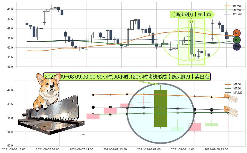 形态多维评估: ⚀ 2021-09-08 09:00:00小时显现 60小时-90小时-120小时均线 【断头铡刀】卖出点 看空信号,后市看跌,卖出