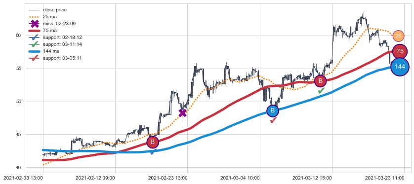 上涨趋势02-03 13:00-03-23 11:00,均线144, 75确认关键支撑3处
