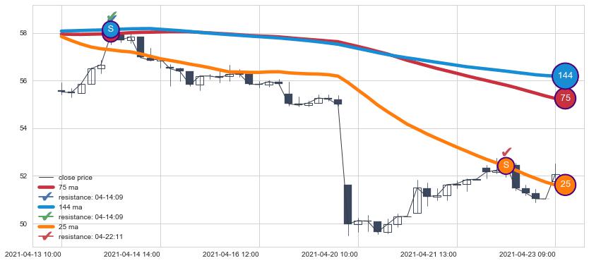 下跌趋势04-13 10:00-04-23 09:00,均线144, 25, 75确认关键阻力2处