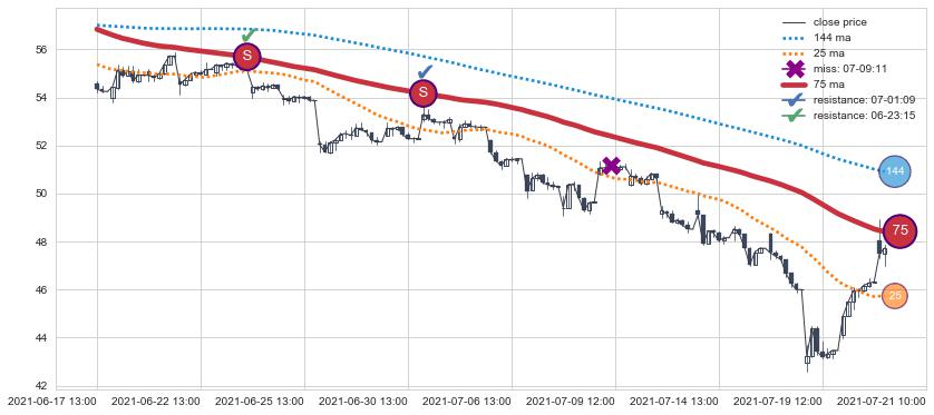 下跌趋势06-17 13:00-07-21 10:00,均线75确认关键阻力2处