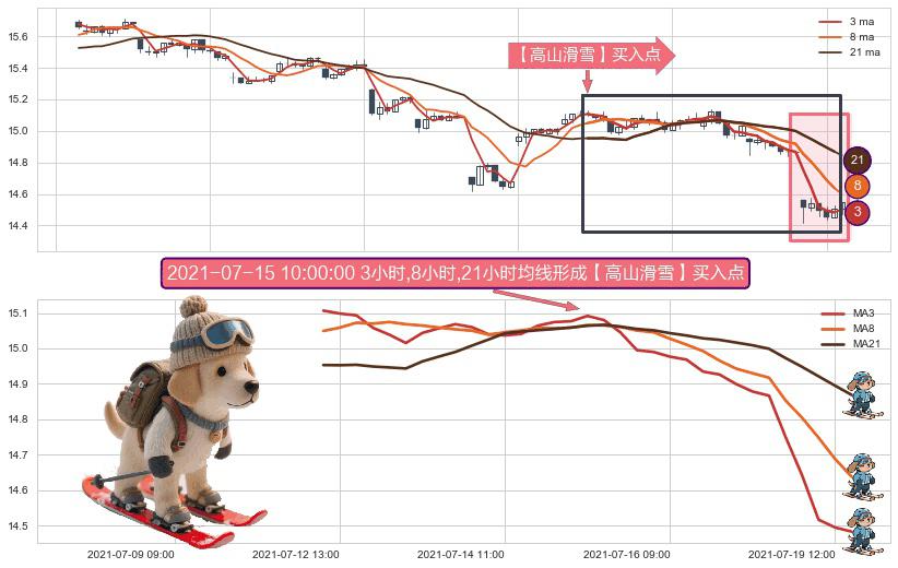 形态多维评估: ⚀ 2021-07-12 12:00:00小时-2021-07-19 13:00:00小时显现 3小时-8小时-21小时均线 【高山滑雪】买入点 看多信号,后市看涨,买入