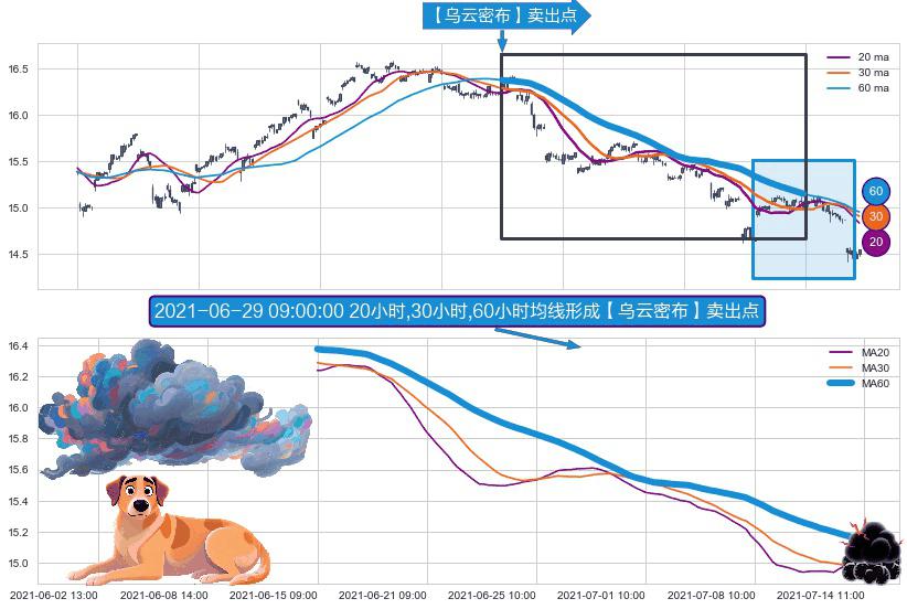 形态多维评估: ⚀ 2021-06-15 09:00:00小时-2021-07-14 10:00:00小时显现 20小时-30小时-60小时均线 【乌云密布】卖出点 看空信号,后市看跌,卖出