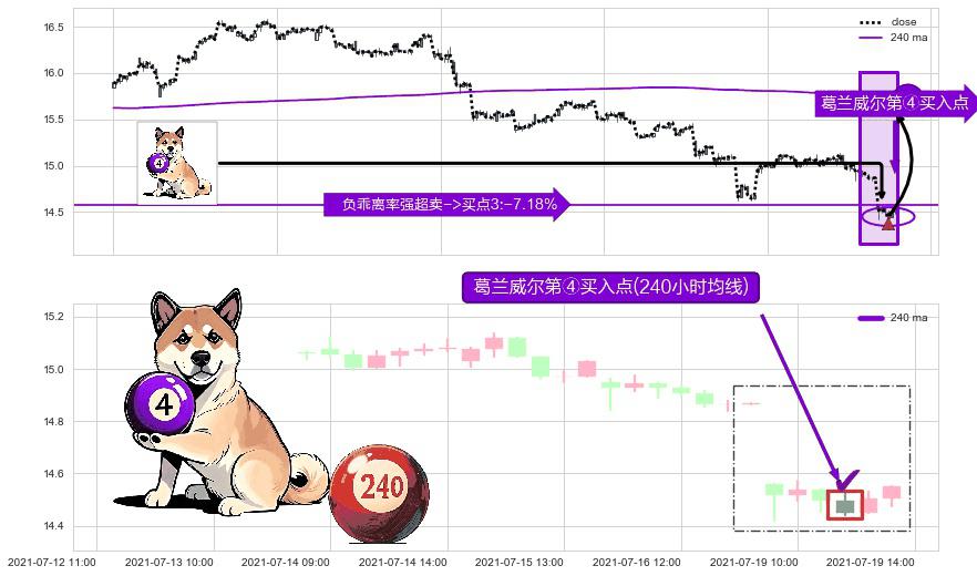 形态多维评估: ⚀ 2021-07-19 12:00:00-小时显现 葛兰威尔均线 240小时均线 第④买入点 下降趋势均值回复的短线反弹信号,后市看涨,买进信号