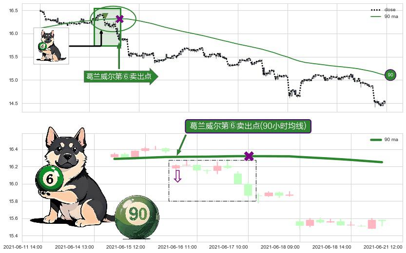 形态多维评估: ⚀ 2021-06-16 09:00:00-小时显现 葛兰威尔均线 90小时均线 第⑥卖出点 走势反转见顶信号,后市看跌,卖出信号