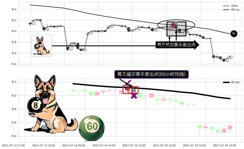 形态多维评估: ⚀ 2021-07-15 11:00:00-小时显现 葛兰威尔均线 60小时均线 第⑧卖出点 下降趋势的中继信号,后市看跌,卖出信号