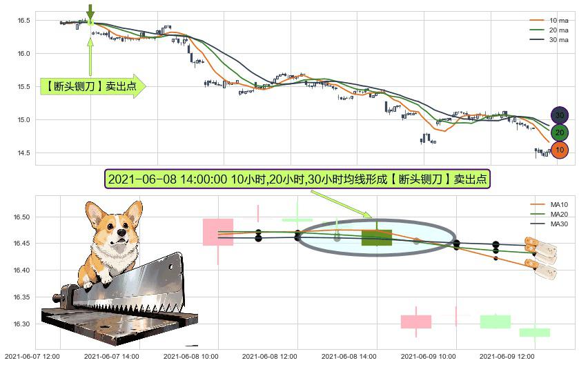 形态多维评估: ⚀ 2021-06-08 14:00:00小时显现 10小时-20小时-30小时均线 【断头铡刀】卖出点 看空信号,后市看跌,卖出
