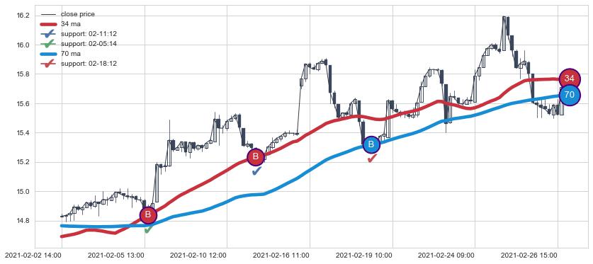 上涨趋势02-02 14:00-03-01 09:00,均线34, 70确认关键支撑3处