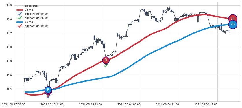 上涨趋势05-17 09:00-06-10 13:00,均线34, 70确认关键支撑2处