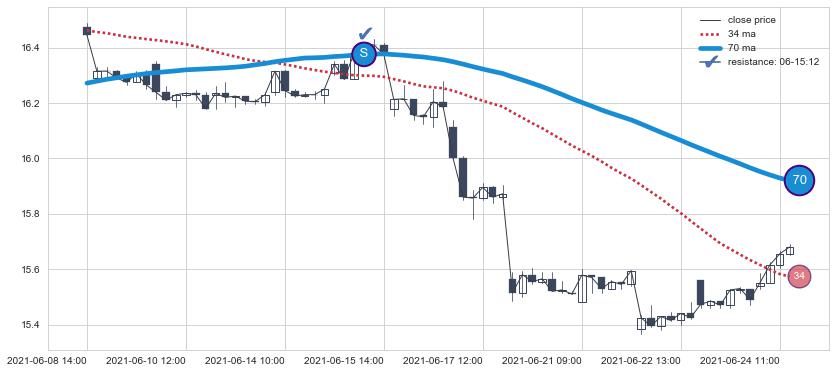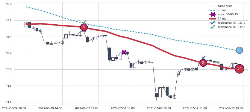 下跌趋势06-29 10:00-07-13 13:00,均线34确认关键阻力2处