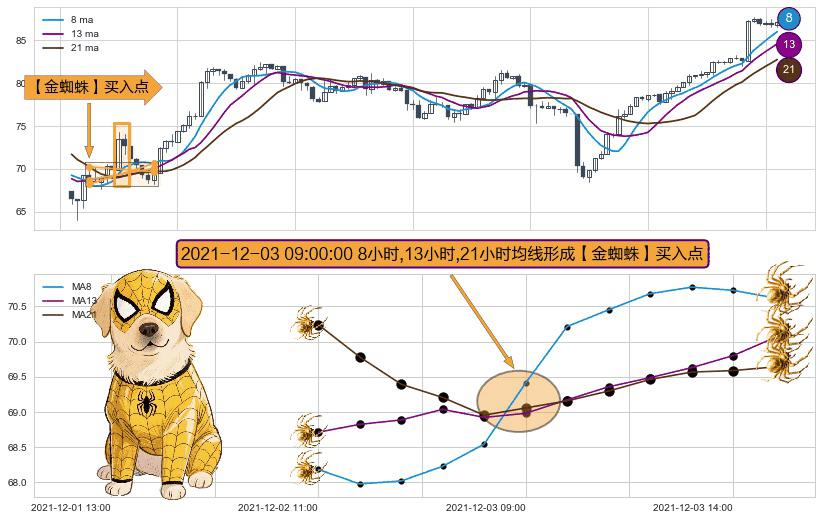 形态多维评估: ⚀ 2021-12-03 09:00:00小时显现 8小时-13小时-21小时均线 【金蜘蛛】买入点 看多信号,后市看涨,买入