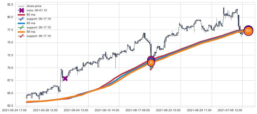 上涨趋势05-24 11:00-07-06 13:00,均线80, 89, 85确认关键支撑1处