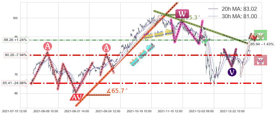 ♘ 在最后的下跌阶段2021-10-20 13:00至2021-12-08 12:00,存在 破位边缘的阻力位 ,阻力价格85.94,可信任强度65.17%,其距离最后价格87.18相差 -1.43%