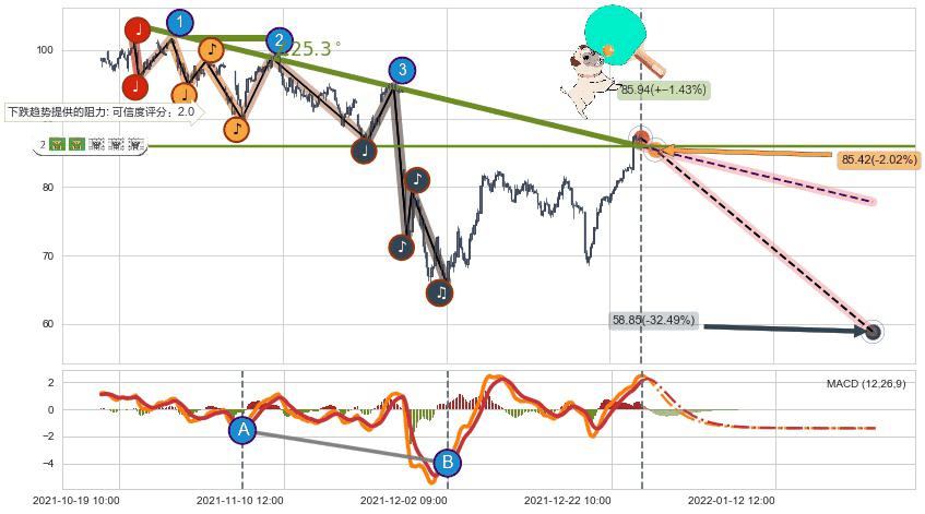 ➢ 预测:2021-12-29 10:00,【试探阻力】稳定目前下跌趋势的前提下,预测价格:85.42