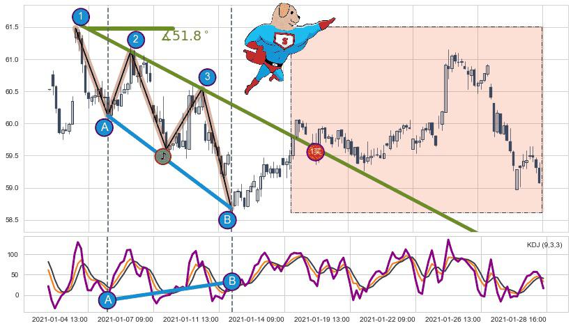 从2021-01-04 09:00至2021-01-21 13:00,共包含101个小时,阶段股价下跌-2.50%,阶段股价变动位移路程比: 1 : 10,下跌趋势角度: 51.8,2021-01-12 09:00向↘︎形成缺口,跳空下跌-1.41%˚