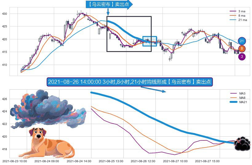 ⚃ 【乌云密布】卖出点长时间对 牛 市转 熊 市进行确认,且均线压制价格走势,但信号发出时间较长,属于【迟滞】看空卖出信号
