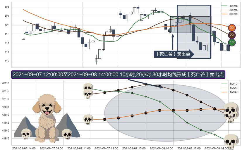⚀ 2021-09-07 13:00:00-小时至2021-09-08 14:00:00-小时显现 10小时-20小时-30小时均线 【死亡谷】卖出点 看空信号,后市看跌,卖出