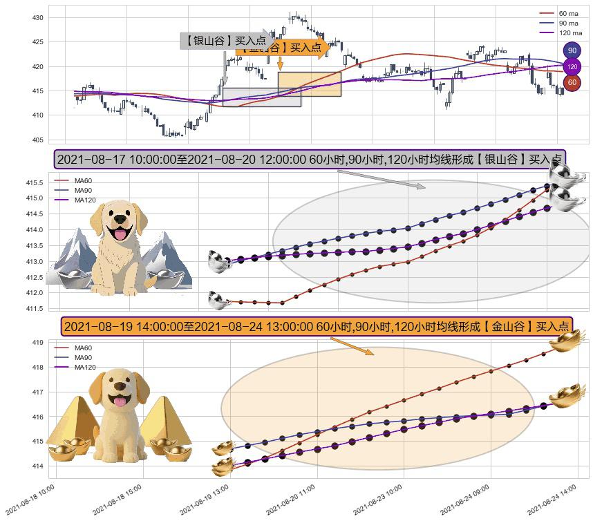 ⚃ 2021-08-19 15:00:00-小时至2021-08-24 13:00:00-小时显现 60小时-90小时-120小时均线 【金山谷】买入点 其再次确认了买入信号,可靠性更强,买入