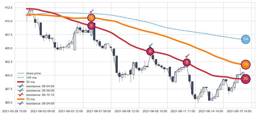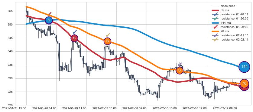 ⚁ MA3和MA8走势平行,且始终保持在短距离内,MA21始终在短中期均线上方,与短中期均线保持一定的距离,微微下行