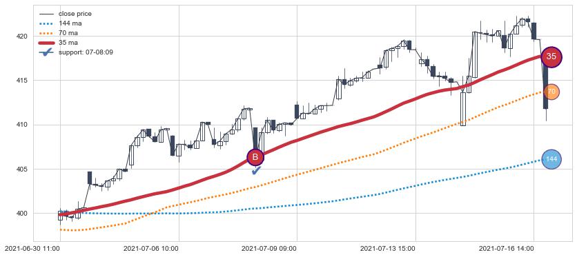 ⚂ 2021-08-06 11:00:00小时突然冒出一根大阳线,一下子顶穿三条均线且收盘价收在各条均线之上