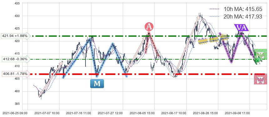 ♘ 阻力价格位421.94,可信任强度83.69%,距离最后交易2021-09-09 14:00形成的收盘价格414.17相差 +1.88%