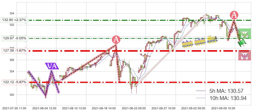 ➢ 【仅预测突破】最后价格:129.73与预测突破价格:129.05→【空间临近】后续最小【反转】第一目标价格→(09-13:15: 126.72 )
