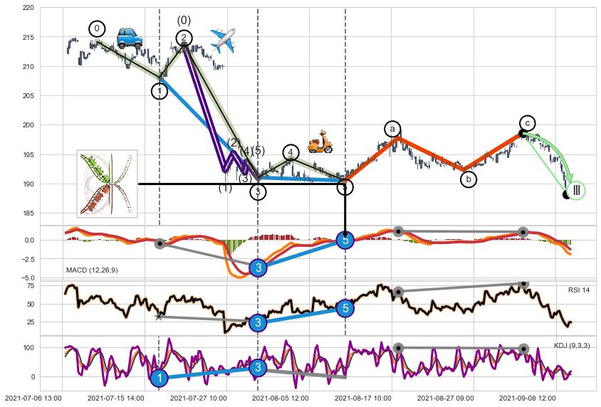 ➢ 1,3,5驱动浪MACD, RSI, KDJ走势都出现【常规背离】反转信号增强