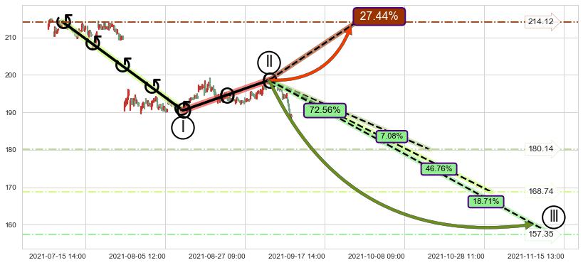 ♘ 在最后的下跌阶段2021-07-07 12:00至2021-09-09 15:00,存在 持续未破位的阻力位 ,阻力价格196.70,可信任强度85.34%,其距离最后价格188.93相差 +4.11%