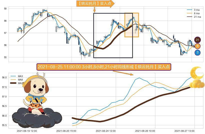 形态多维评估: ⚀ 2021-08-20 14:00:00小时-2021-08-27 13:00:00小时显现 3小时-8小时-21小时均线 【烘云托月】买入点 看多信号,后市看涨,买入