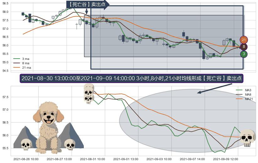 形态多维评估: ⚀ 2021-08-30 14:00:00-小时至2021-09-09 14:00:00-小时显现 3小时-8小时-21小时均线 【死亡谷】卖出点 看空信号,后市看跌,卖出