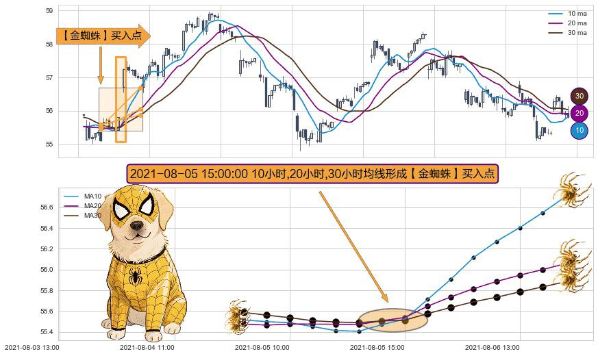 形态多维评估: ⚀ 2021-08-05 15:00:00小时显现 10小时-20小时-30小时均线 【金蜘蛛】买入点 看多信号,后市看涨,买入