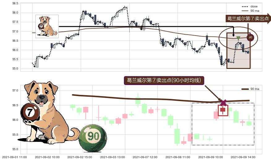 形态多维评估: ⚀ 2021-09-09 10:00:00-小时显现 葛兰威尔均线 90小时均线 第⑦卖出点 下降趋势的中继信号,后市看跌,卖出信号