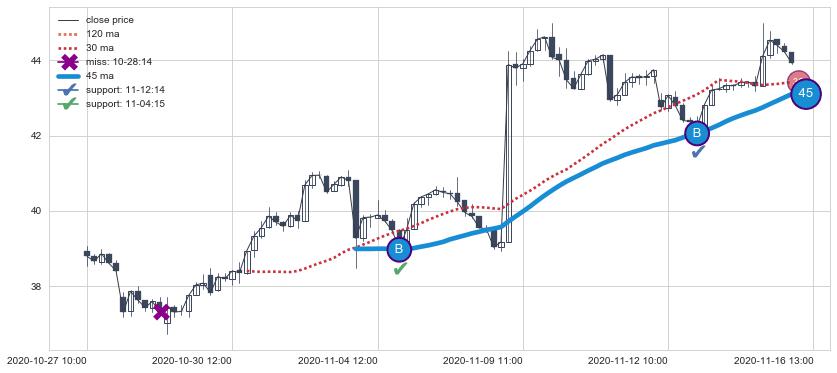 上涨趋势10-27 10:00-11-16 13:00,均线45确认关键支撑2处