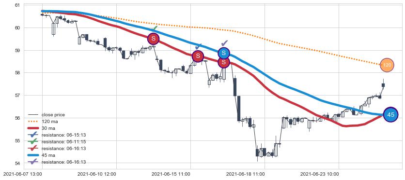 下跌趋势06-07 13:00-06-25 09:00,均线45, 30确认关键阻力3处