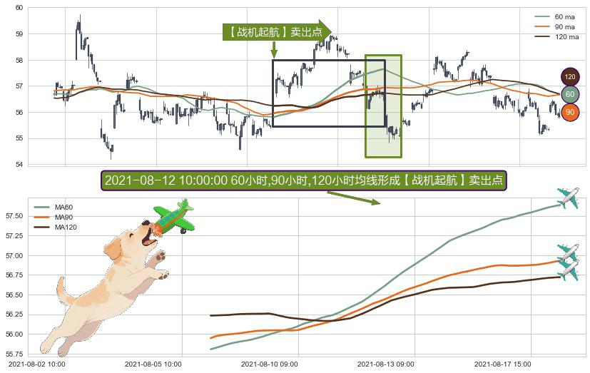 形态多维评估: ⚀ 2021-08-05 15:00:00小时-2021-08-18 13:00:00小时显现 60小时-90小时-120小时均线 【战机起航】卖出点 看空信号,后市看跌,卖出